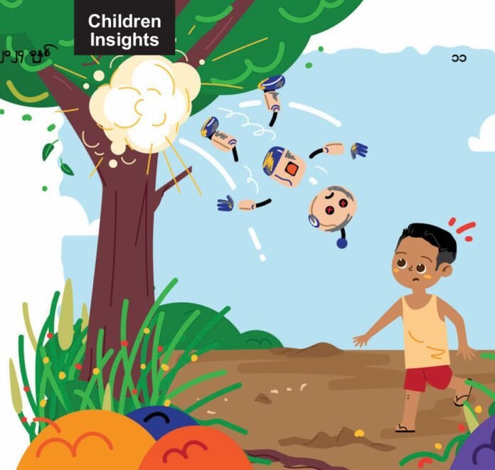 အစောရဲ့အိမ်မက်ထဲမှာ အစောရယ်၊ နာနတ်သီးစက်ရုပ်ကလေးရယ်နဲ့ အတူတူ အိမ်အပြင်ထွက်ပြီး လူတွေ သိပ်မသွားကြတဲ့ တောစပ်က ခြုံတွေကြားထဲက အပင်တွေကို တက်ကြတယ်တဲ့။ အပင်ကြားထဲမှာ ဆော့နေရင်း လူပုံစက်ရုပ်ကလေးက အပင်ကြားထဲညပ်နေတဲ့ ခပ်လုံးရှည်ရှည် အရာလေးတစ်ခုကိုတွေ့ပြီး ဆွဲထုတ်လိုက်တယ်တဲ့။ အဲဒါက အရင်တုန်း က အဲဒီတောစပ်မှာ စစ်ဖြစ်တုန်းက တစ်ဖက် နဲ့ တစ်ဖက် လက်နက်တွေနဲ့ ပစ်ကြရင်း မပေါက်ကွဲသေးဘဲ ကျန်နေတဲ့ စစ်ကျန်လက်နက်ဖြစ်နေတယ်။